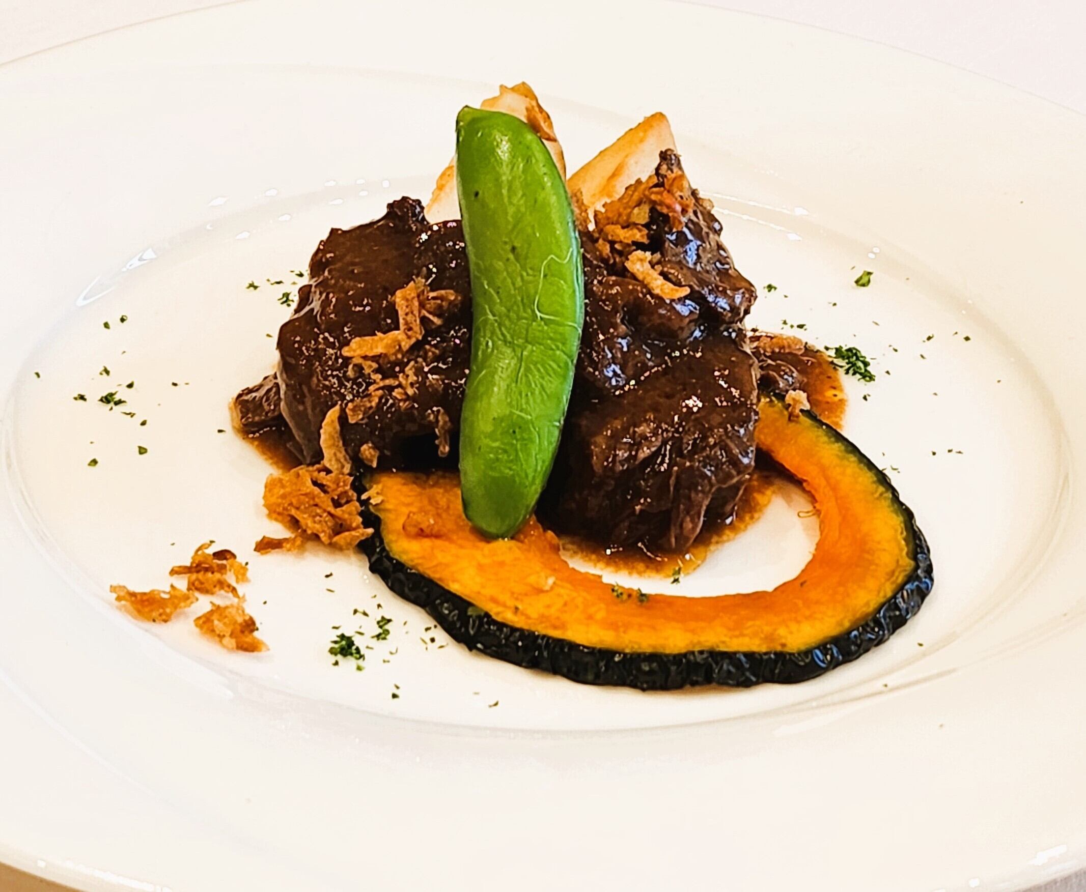 たっぷりの赤ワインと野菜、銘柄牛を煮込んだステーキ屋のシェフが作る赤ワイン煮込み。しっかりと漬け込んでから、じっくり煮込むことにより肉質はトロトロに仕上げております。